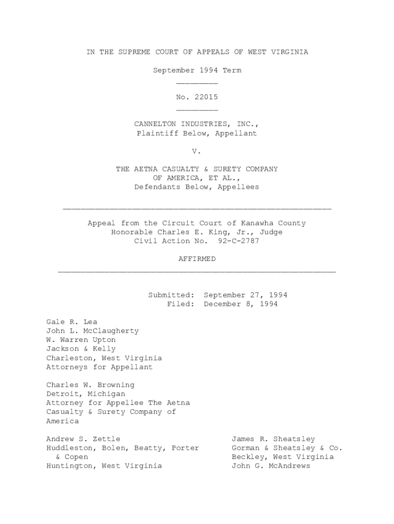 IN THE SUPREME COURT OF APPEALS OF WEST VIRGINIA September 1994 Term ___ No. 22015 ___ CANNELLONI INDUSTRIES, INC., Plaintiff Below, Appellant V. THE AETNA CASUALTY & SURETY COMPANY OF AMERICA, ET