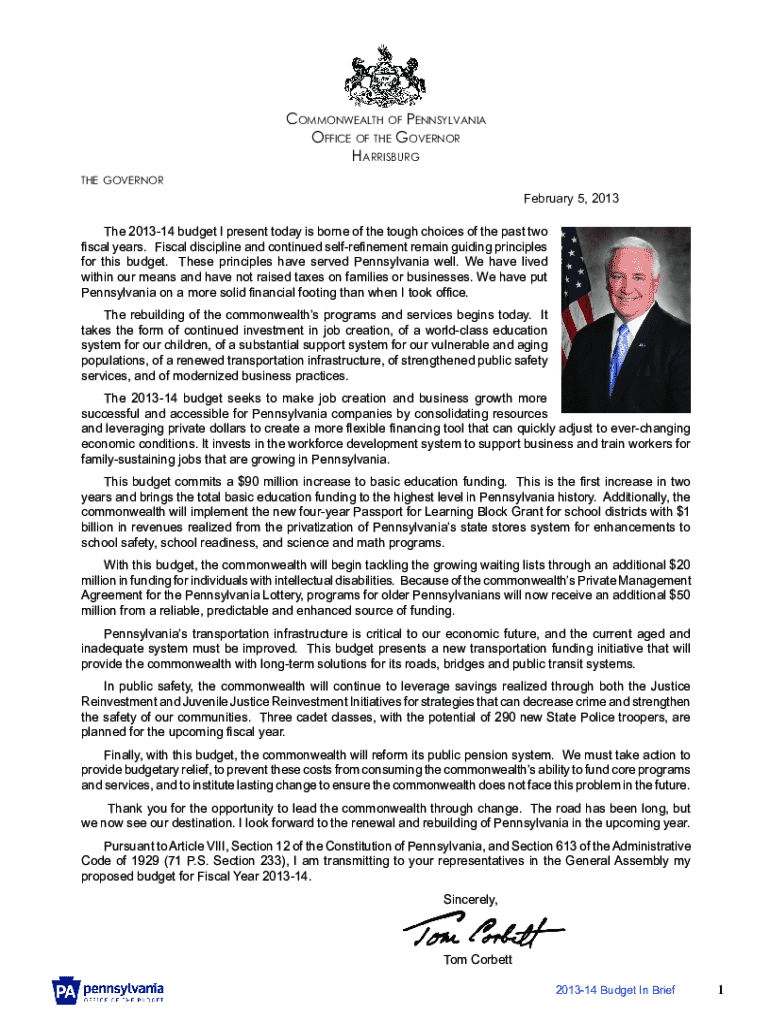 Commonwealth of Pennsylvania Office of the Governor Harrisburg the governor February 5, 2013 The 201314 budget I present today is borne of the tough choices of the past two fiscal years. Fiscal discipline