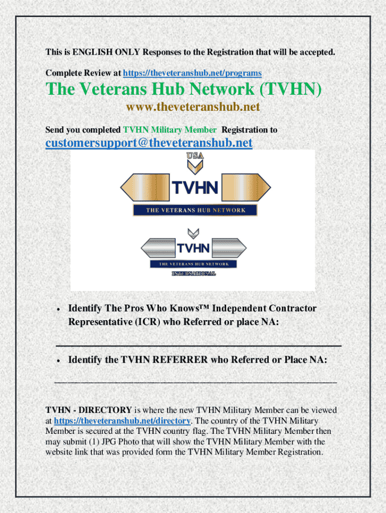 This is ENGLISH ONLY Responses to the Registration that will be accepted. Complete Review at https://theveteranshub.net/programsThe Veterans Hub Network (TVH) www.theveteranshub.net Send you completed