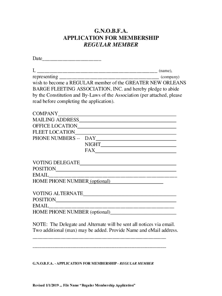 G.N.O.B.F.A. APPLICATION FOR MEMBERSHIP REGULAR MEMBER Date___ I, ___ (name), representing ___ (company) wish to become a REGULAR member of the GREATER NEW ORLEANS BARGE FLEETING ASSOCIATION, INC.