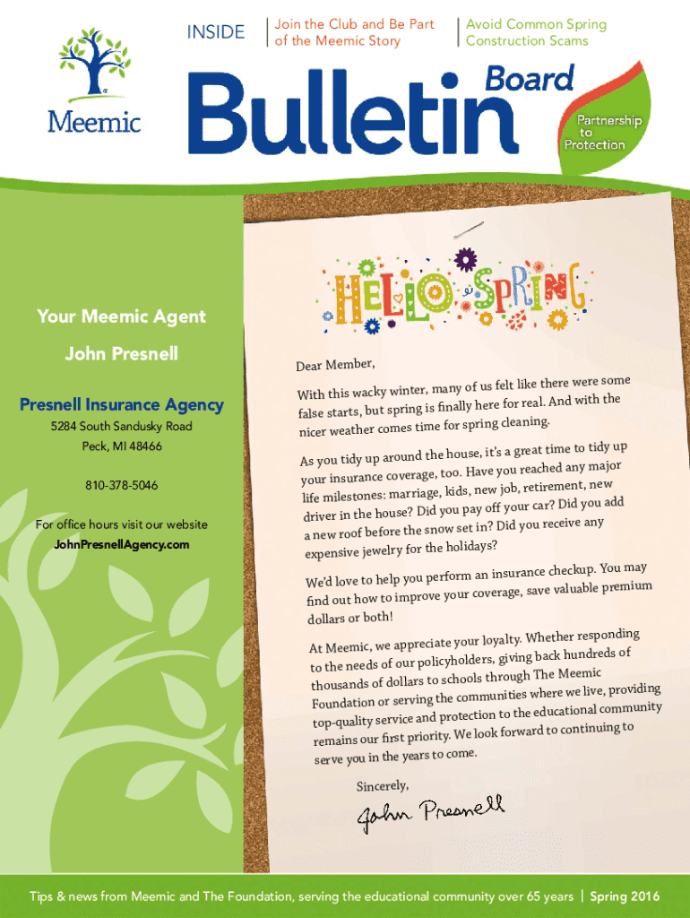 INSIDEJoin the Club and Be Part of the Meemic StoryAvoid Common Spring Construction ScamsYour Meemic Agent John Presnell Presnell Insurance Agency 5284 South Sandusky Road Peck, MI 48466 8103785046 For office hours visit our website JohnPresnellAgency.comDear Member,re some ny of us felt like there we ma er, nt wi y ck wa is th With the lly here for real. And with na fi is g rin sp t bu , rts sta false for spring cleaning. nicer weather comes time tidy up house, its a great time to As you...