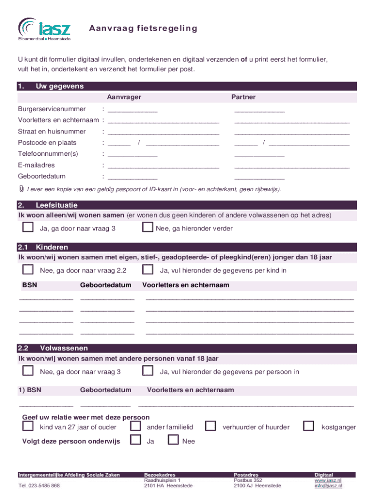 Aanvraag fietsregelingU kunt dit formulier digitaal invullen, ondertekenen en digitaal verzenden of u print eerst het formulier, vult het in, ondertekent en verzendt het formulier per post.1.Uw gegevens