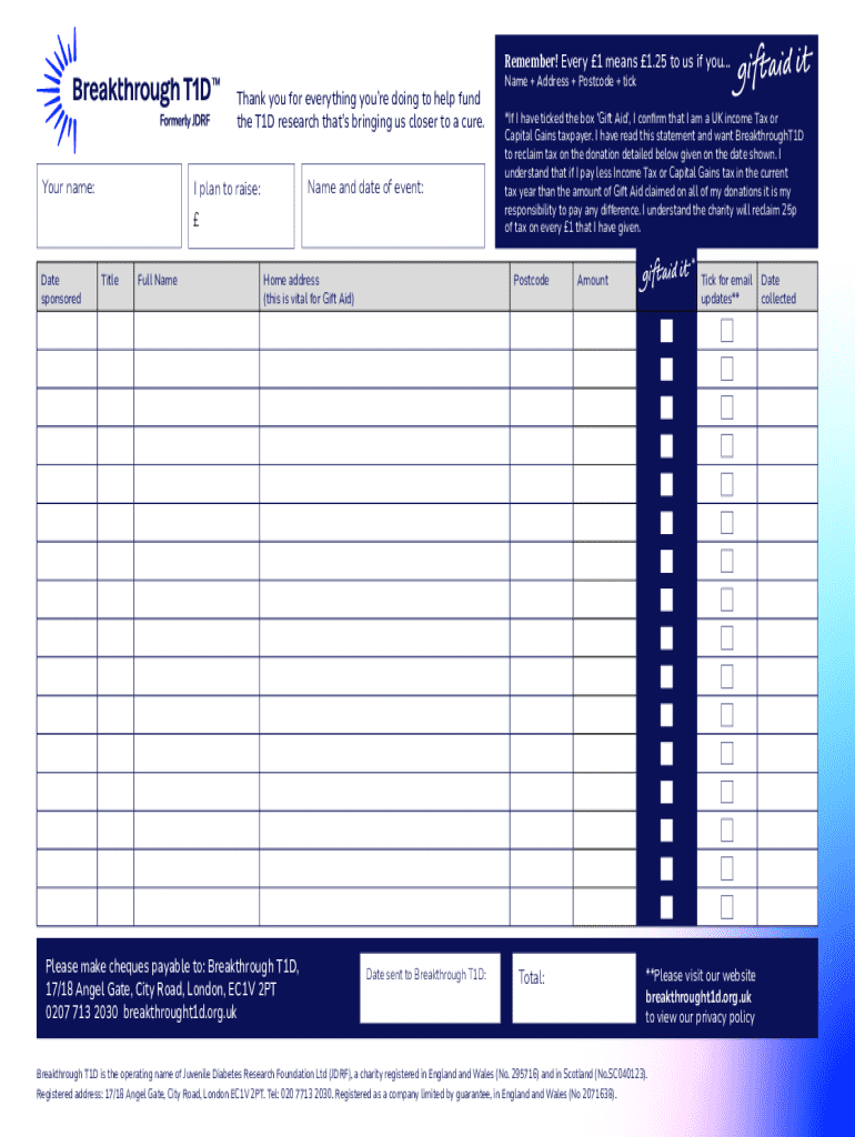 Remember! Every 1 means 1.25 to us if you... Thank you for everything youre doing to help fund the T1D research thats bringing us closer to a cure. Your name:Name and date of event:I plan to raise: Date sponsoredTitleFull NameHome address (this is vital for Gift Aid)Please make cheques payable to: Breakthrough T1D, 17/18 Angel Gate, City Road, London, EC1V 2PT 0207 713 2030 breakthrought1d.org.ukName + Address + Postcode + tick*If I have ticked the box Gift Aid,