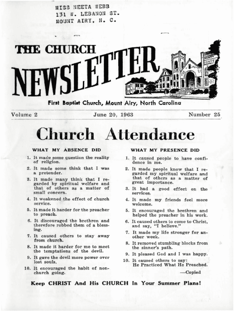MIS S NEETA WEB B 131 1. L EBA NON ST . UOUNT AI RY , N. C.first Baptiet Church, Mount Airy, North Carolina Volume 2June 20 , 1963Number 25Church Attendance WHAT MY ABSENCE DID 1. It made some gu