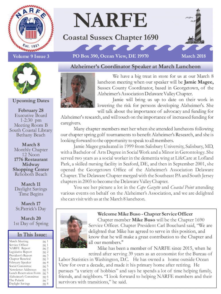 NARFE Coastal Sussex Chapter 1690 Volume 9 Issue 3PO Box 390, Ocean View, DE 19970March 2018Alzheimers Coordinator Speaker at March LuncheonUpcoming Dates February 28 Executive Board 12:30 pm Meeting Room B South Coastal Library Bethany Beach March 8 Monthly Chapter 12 Noon 1776 Restaurant Midway Shopping Center Rehoboth Beach March 11 Daylight Savings Time BeginsWe have a big treat in store for us at our March 8 luncheon meeting when our speaker will be Jamie Magee, Sussex County Coordinator,