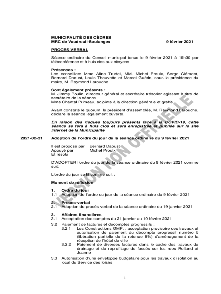 MUNICIPALIT DES CDRES MRC de VaudreuilSoulanges9 fvrier 2021PROCSVERBAL Sance ordinaire du Conseil municipal tenue le 9 fvrier 2021 19h30 par tlconfrence et huis clos aux citoyens Prsences : Les conseillers