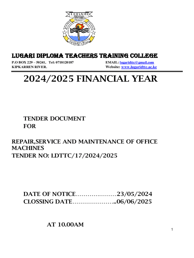LUGARI DIPLOMA TEACHERS TRAINING COLLEGE P.O BOX 229 50241, Tel: 0718120187 KIPKARREN RIVER.EMAIL: lugaridttc@gmail.comWebsite: www.lugaridttc.ac.ke2024/2025 FINANCIAL YEARTENDER DOCUMENT FOR REPAIR,SERVICE AND MAINTENANCE OF OFFICE MACHINES TENDER NO: LDTTC/17/2024/2025DATE OF NOTICE23/05/2024 CLOSSING DATE..06/06/2025AT 10.00AM 1TABLE OF CONTENTS PageINTRODUCTION .....................................................................