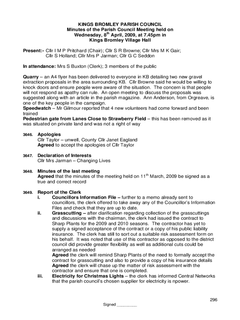 KINGS BROMLEY PARISH COUNCIL Minutes of the Parish Council Meeting held on Wednesday, 8th April, 2009, at 7.45pm in Kings Bromley Village Hall Present: Cllr I M P Pritchard (Chair); Cllr S R Browne;
