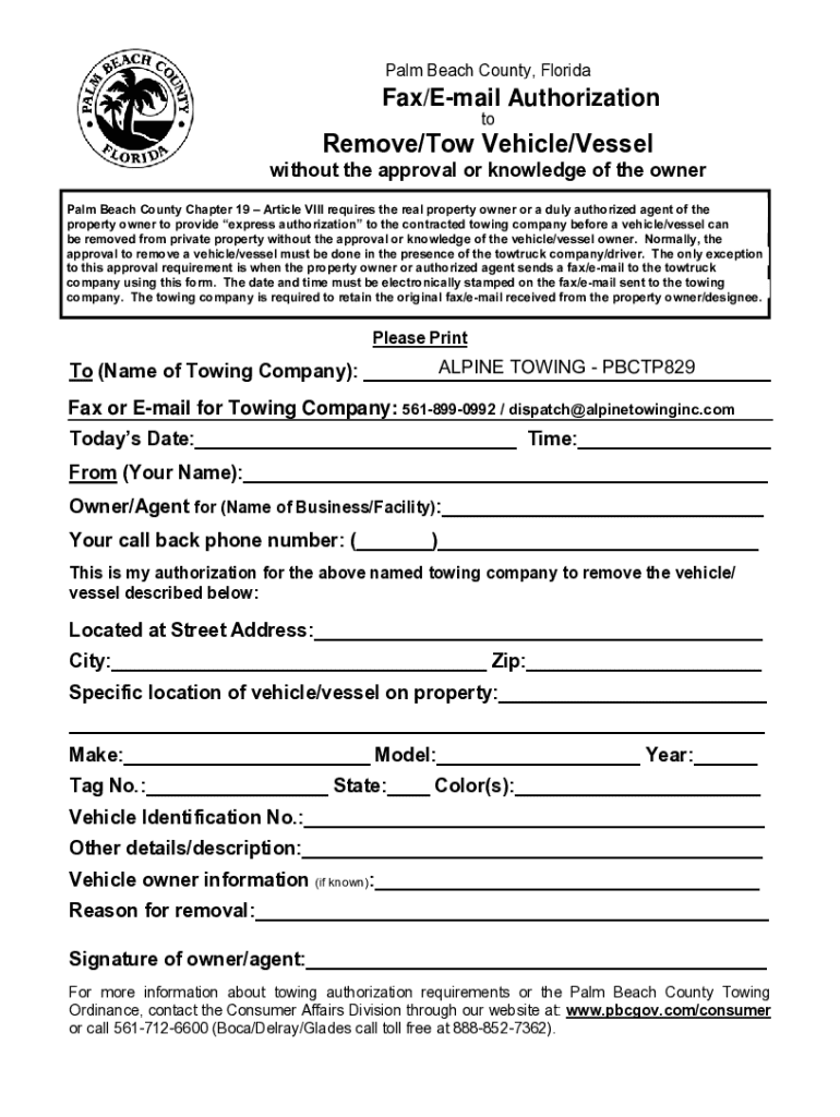 Get the free Fax Authorization - Remove/Tow Vehicle/Vessel