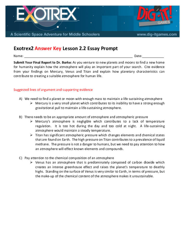 Get the free Exotrex2 Answer Key Lesson 2.2 Essay Prompt