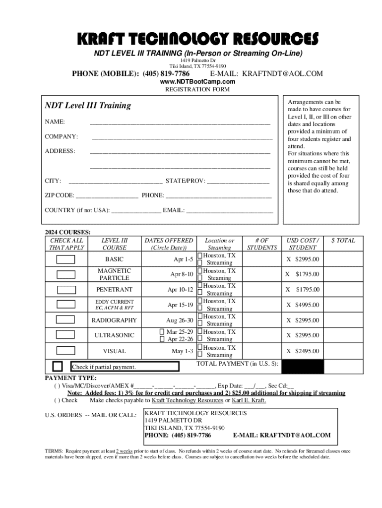 KRAFT TECHNOLOGY RESOURCES NDT LEVEL III TRAINING (Unperson or Streaming Online) 1419 Palmetto Dr Wiki Island, TX 775549190PHONE (MOBILE): (405) 8197786EMAIL: KRAFTNDT@AOL.COMwww.NDTBootCamp.com REGISTRATION