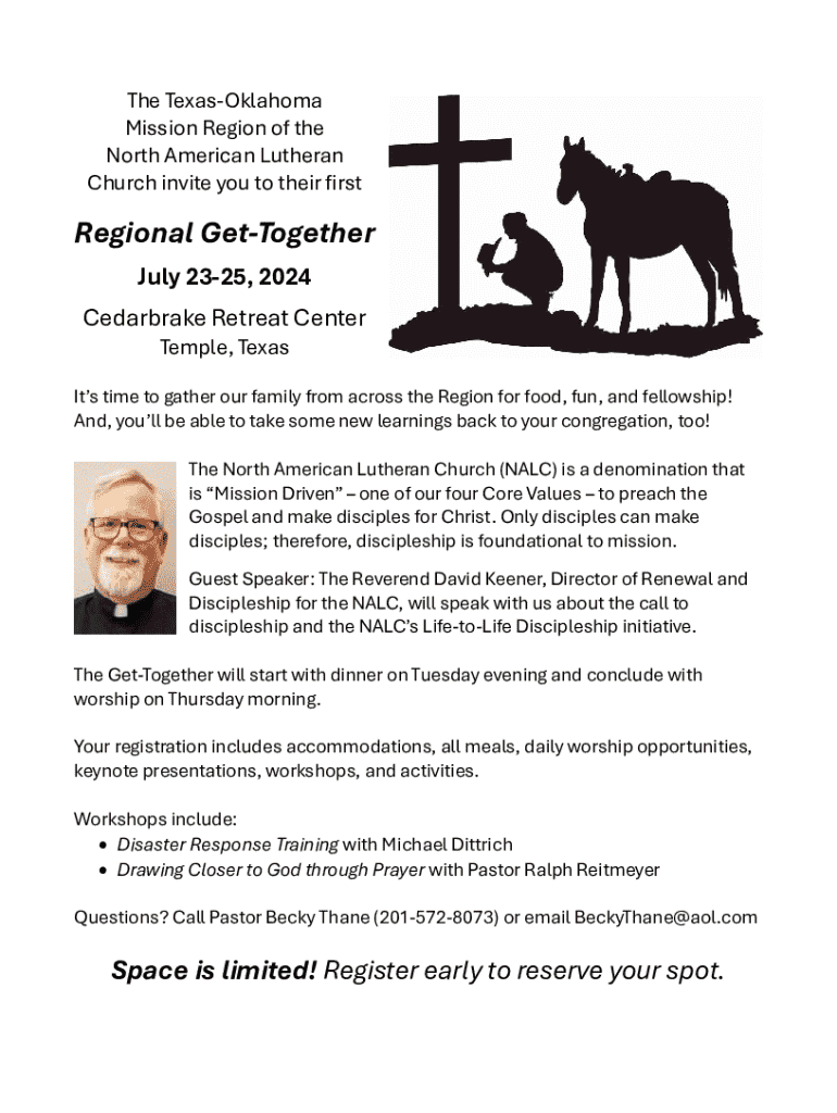 The TexasOklahoma Mission Region of the North American Lutheran Church invite you to their rstRegional GetTogether July 2325, 2024 Cedarbrake Retreat Center Temple, Texas Its time to gather our family from across the Region for food, fun, and fellowship! And, youll be able to take some new learnings back to your congregation, too! The North American Lutheran Church (NALC) is a denomination that is Mission Driven one of our four Core Values to preach the Gospel and make disciples for Christ
