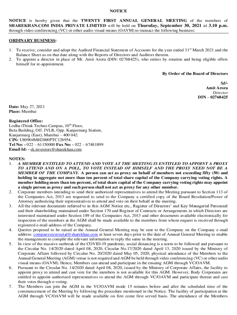 NOTICE is hereby given that the TWENTY FIRST ANNUAL GENERAL MEETING of the members of SHAREKHAN.COM INDIA PRIVATE LIMITED will be held on Thursday, September 30, 2021, at 3.10 p.m. through video conferencing