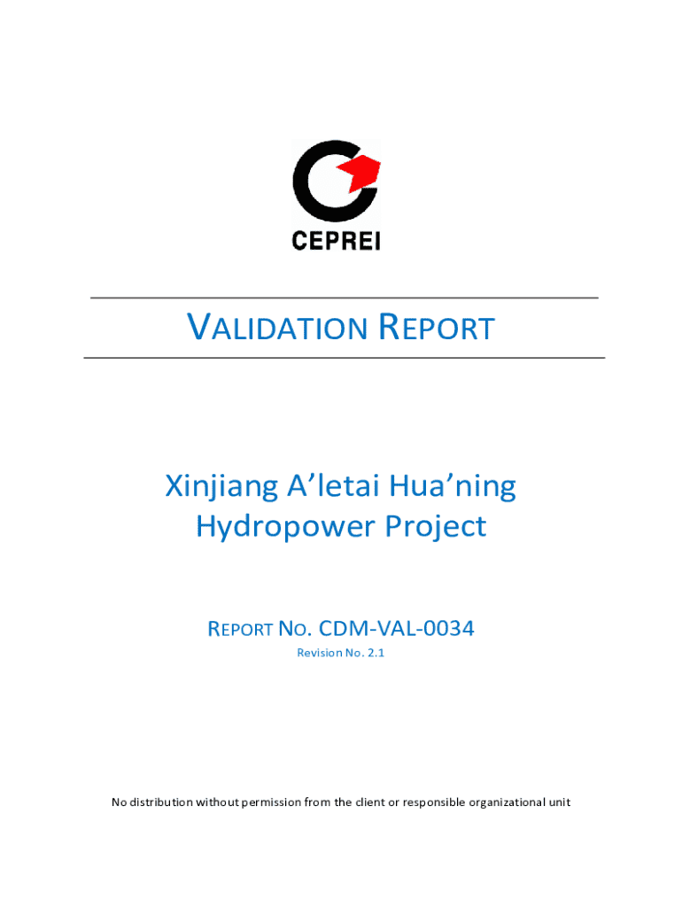 VALIDATION REPORTXinjiang Aletai Huaning Hydropower Project REPORT NO. CDMVAL0034 Revision No. 2.1No distribution without permission from the client or responsible organizational unitCEPREI CERTIFICATION BODY VALIDATION REPORTReport No. CDMVAL0034Report No: CDMVAL0034, rev.2.1Date of first issue 19/03/2012Revision No. 2.1Date of this revision 23/09/2012Project name: Xinjiang Aletai Huaning Hydropower Project Client: GFACC (IOM) Limited Host country: China Methodology:
