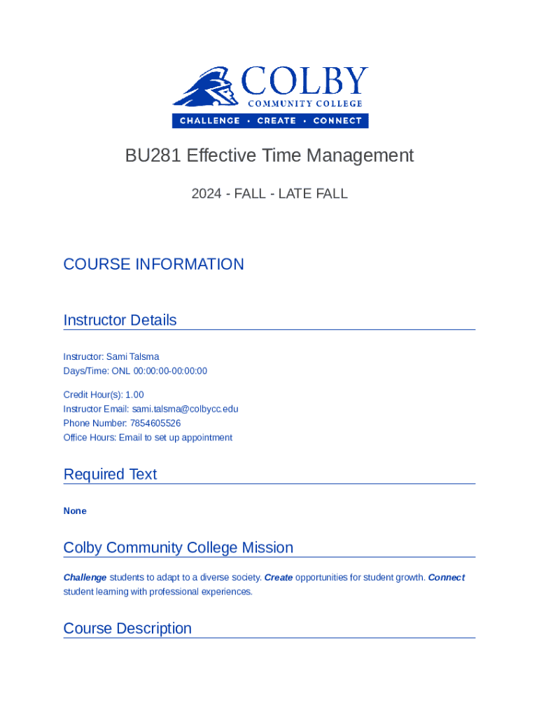 BU281 Effective Time Management 2024 FALL LATE FALLCOURSE INFORMATION Instructor Details Instructor: Sami Talsma Days/Time: ONL 00:00:0000:00:00 Credit Hour(s): 1.00 Instructor Email: sami.talsma@colbycc.edu Phone Number: 7854605526 Office Hours: Email to set up appointmentRequired Text NoneColby Community College Mission Challenge students to adapt to a diverse society. Create opportunities for student growth. Connect student learning with professional experiences.Course DescriptionMost...