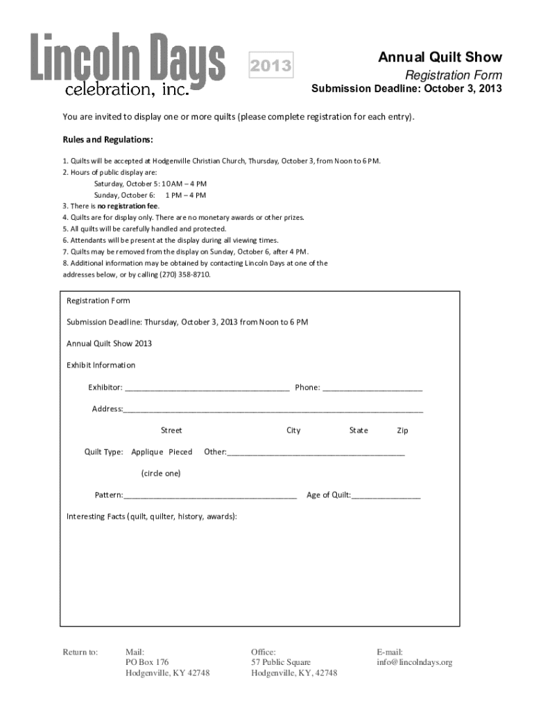 Annual Quilt Show2013Registration FormSubmission Deadline: October 3, 2013 You are invited to display one or more quilts (please complete registration for each entry). Rules and Regulations: 1. Quilts