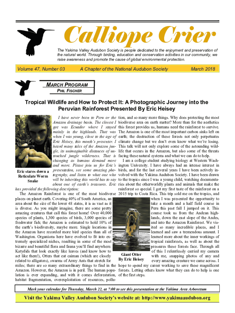 Calliope CrierThe Yakima Valley Audubon Society is people dedicated to the enjoyment and preservation of the natural world. Through birding, education and conservation activities in our community,