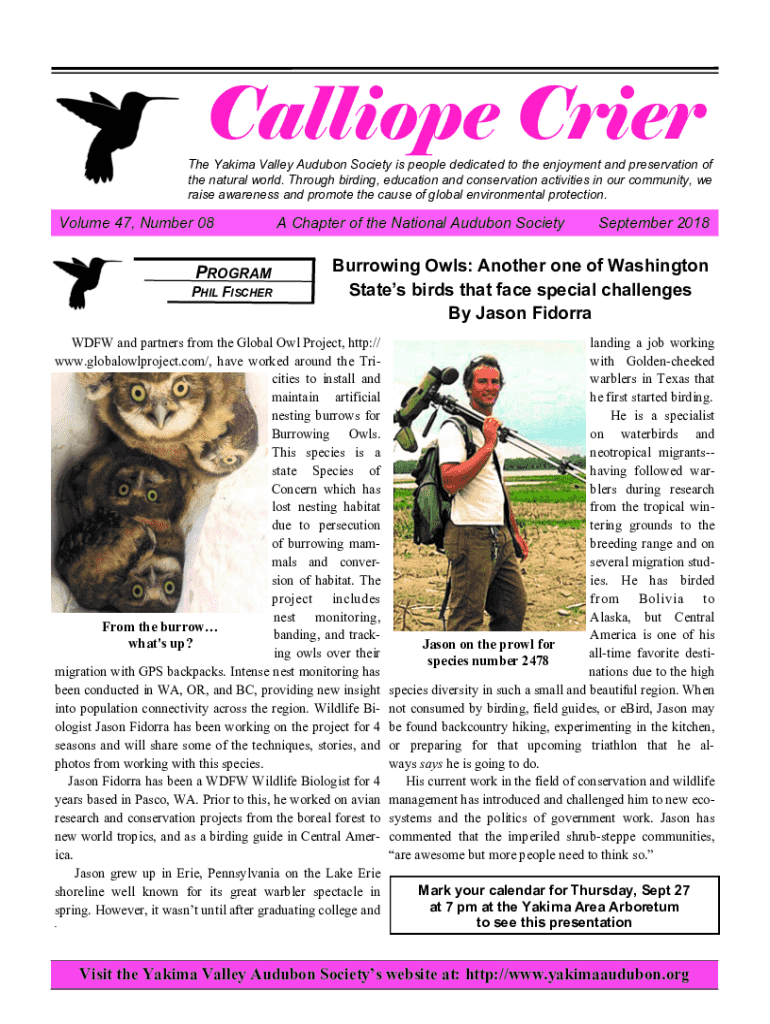 Calliope CrierThe Yakima Valley Audubon Society is people dedicated to the enjoyment and preservation of the natural world. Through birding, education and conservation activities in our community, we raise awareness and promote the cause of global environmental protection.Volume 47, Number 08PROGRAM PHIL FISCHERA Chapter of the National Audubon SocietySeptember 2018Burrowing Owls: Another one of Washington States birds that face special challenges By Jason FidorraWDFW and partners from the...