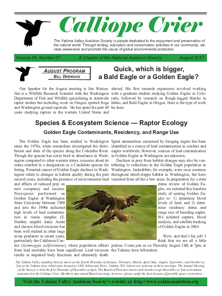 Calliope CrierThe Yakima Valley Audubon Society is people dedicated to the enjoyment and preservation of the natural world. Through birding, education and conservation activities in our community, we raise awareness and promote the cause of global environmental protection.Volume 46, Number 07A Chapter of the National Audubon SocietyAUGUST PROGRAM BILL DRENGUISAugust 2017Quick, which is bigger, a Bald Eagle or a Golden Eagle?Our Speaker for the August meeting is Jim Watson. Jim is a
