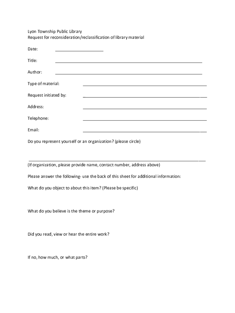 Lyon Township Public Library Request for reconsideration/reclassification of library material Date:___Title:___Author:___Type of material:___Request initiated by:___Address:___Telephone:___Email:___Do