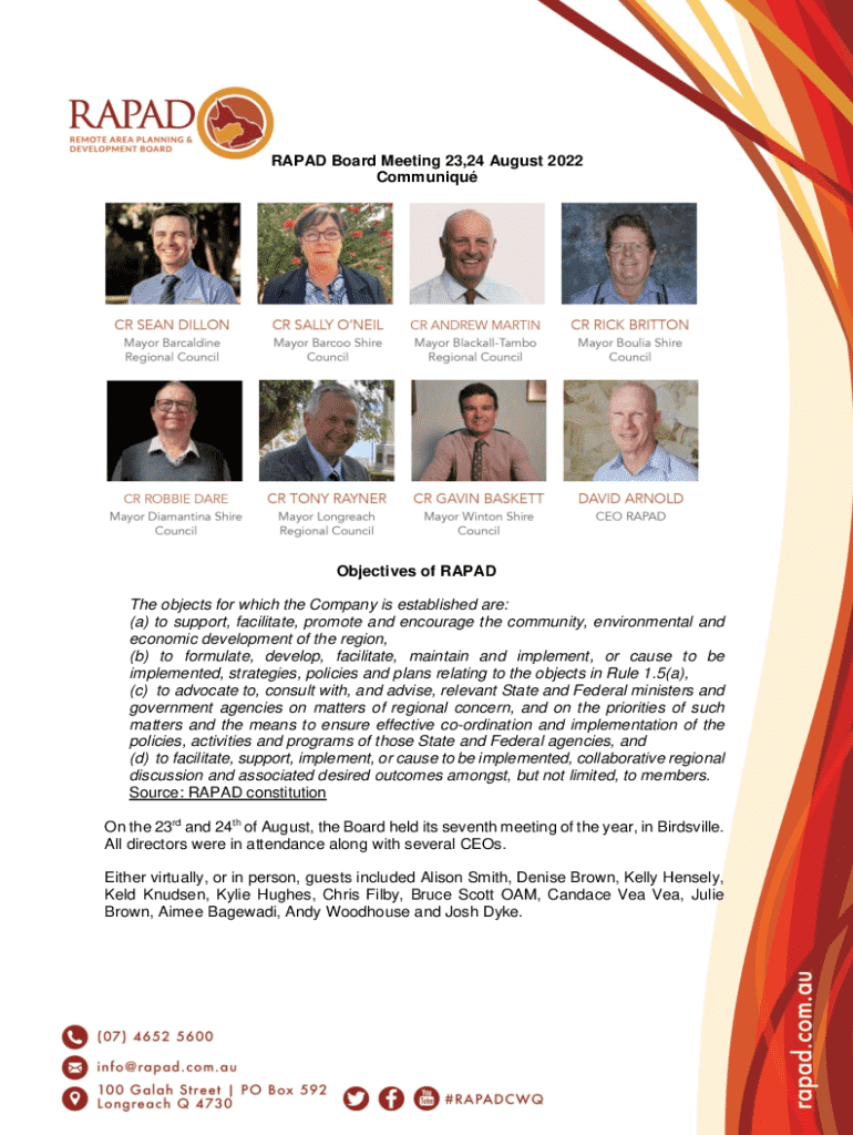 RAPAD Board Meeting 23,24 August 2022 CommuniquObjectives of RAPAD The objects for which the Company is established are: (a) to support, facilitate, promote and encourage the community, environmental