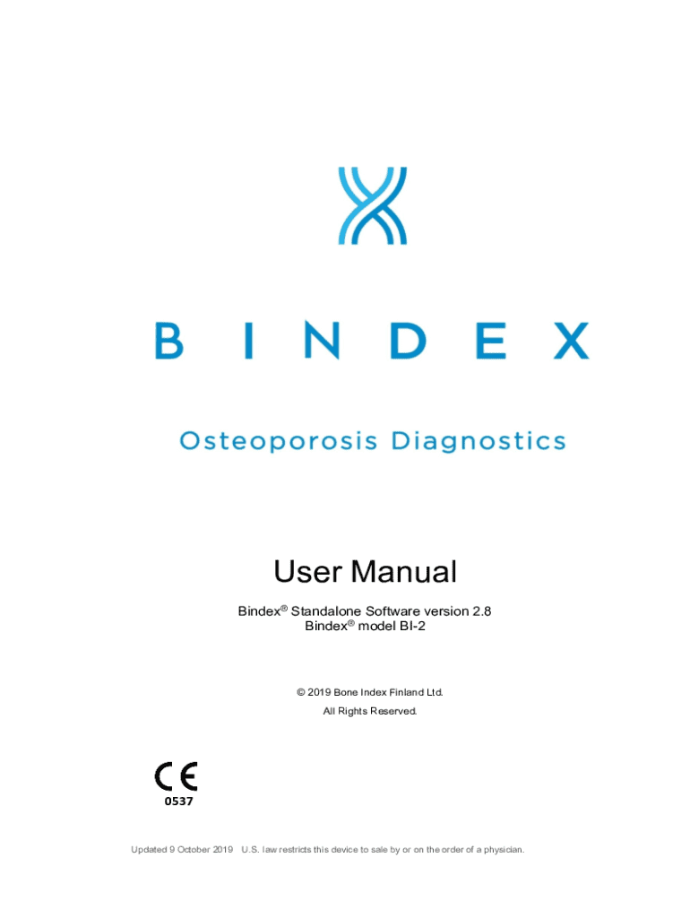 User Manual Bindex Standalone Software version 2.8 Bindex model BI2 2019 Bone Index Finland Ltd. All Rights Reserved.0537Updated 9 October 2019 U.S. law restricts this device to sale by or on the order of a physician.Table of Contents 1. 2. 3.List of figures................................................................................................ 4 Warnings and precautions .......................................................................... 8 Symbols and Abbreviations