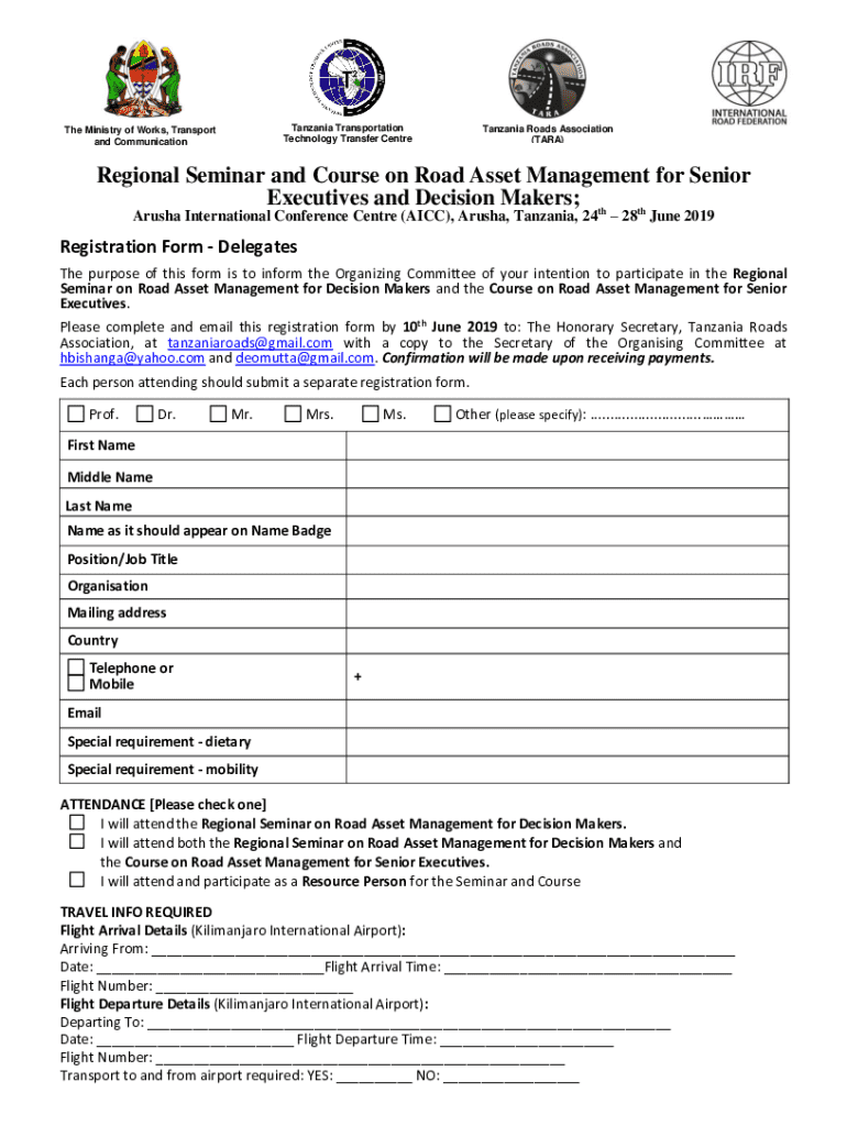 Tanzania Transportation Technology Transfer CentreThe Ministry of Works, Transport and CommunicationTanzania Roads Association (TARA)Regional Seminar and Course on Road Asset Management for Senior Executives and Decision Makers; th th Arusha International Conference Centre (AICC), Arusha, Tanzania, 24 28 June 2019Registration Form Delegates The purpose of this form is to inform the Organizing Committee of your intention to participate in the Regional Seminar on Road Asset Management