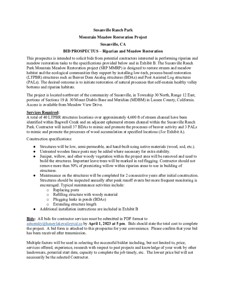 Susanville Ranch Park Mountain Meadow Restoration Project Susanville, CA BID PROSPECTUS Riparian and Meadow Restoration This prospectus is intended to solicit bids from potential contractors interested in performing riparian and meadow restoration tasks to the specifications provided below and in Exhibit B. The Susanville Ranch Park Mountain Meadow Restoration project (SRP MMRP) is designed to restore stream and meadow habitat and the ecological communities they support by installing lowtech,