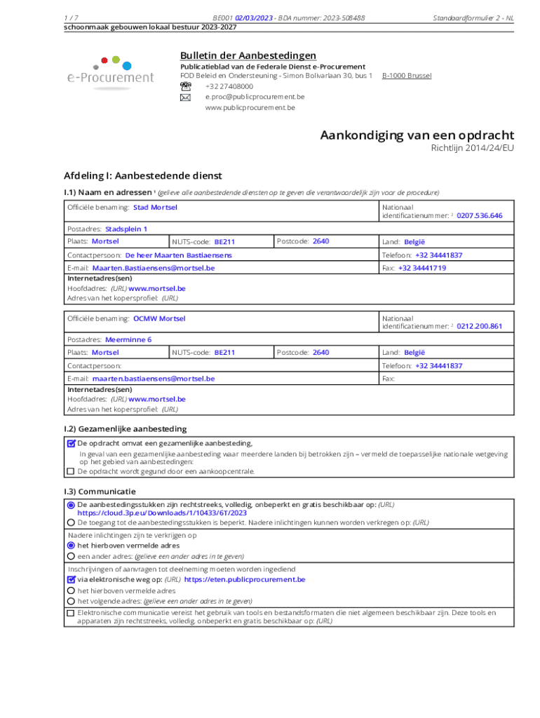 1/7 BE001 02/03/2023 BDA nummer: 2023508488 schoonmaak gebouwen lokaal bestuur 20232027Standaardformulier 2 NLBulletin der Aanbestedingen Publicatieblad van de Federale Dienst eProcurement FOD Beleid