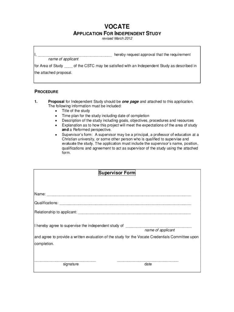 VOCATE APPLICATION FOR INDEPENDENT STUDY revised March 2012I, ___ hereby request approval that the requirement name of applicant for Area of Study ___ of the CSTC may be satisfied with an Independent Study as described in the attached proposal.PROCEDURE 1.Proposal for Independent Study should be one page and attached to this application. The following information must be included: Title of the study Time plan for the study including date of completion Description of the study including