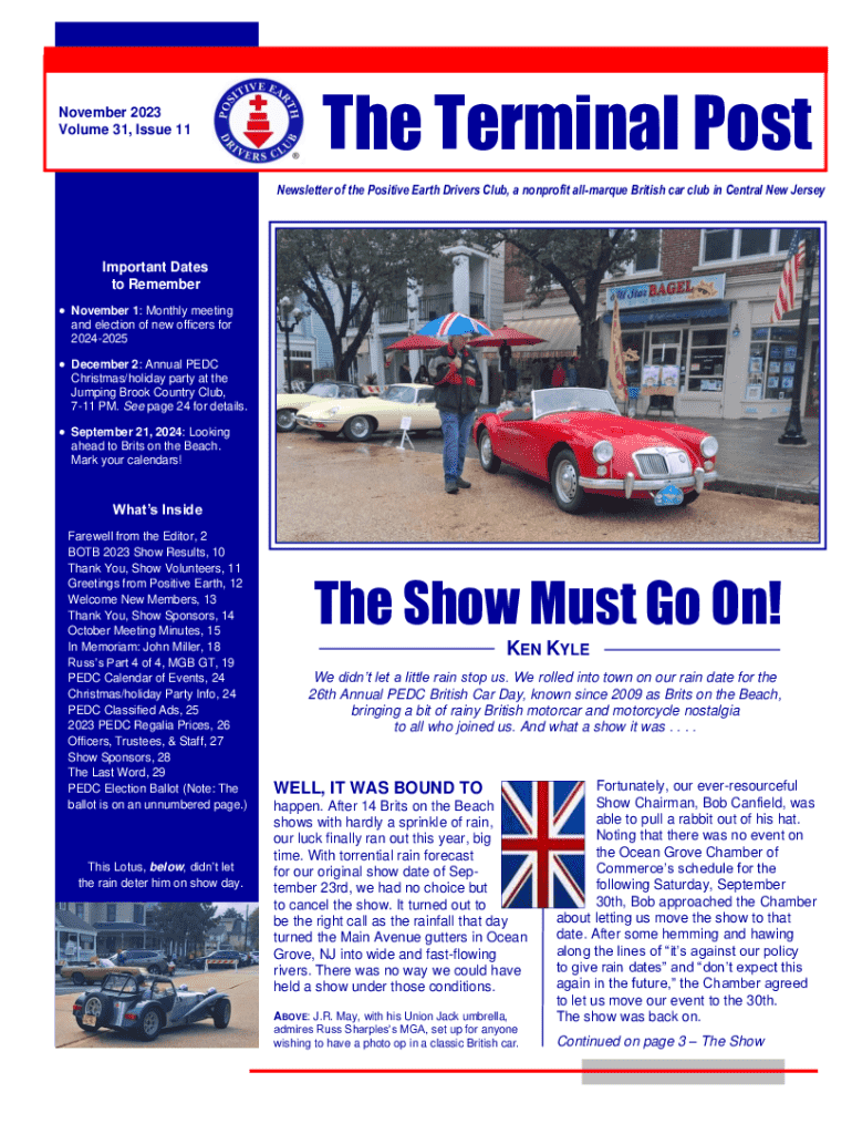 November 2023 Volume 31, Issue 11The Terminal Post Newsletter of the Positive Earth Drivers Club, a nonprofit allmarque British car club in Central New JerseyImportant Dates to Remember November 1: Monthly meeting and election of new officers for 20242025 December 2: Annual PEDC Christmas/holiday party at the Jumping Brook Country Club, 711 PM. See page 24 for details. September 21, 2024: LookingPEDC Drive to NGMMNJahead to Brits on the Beach. Mark your calendars!DUNCAN