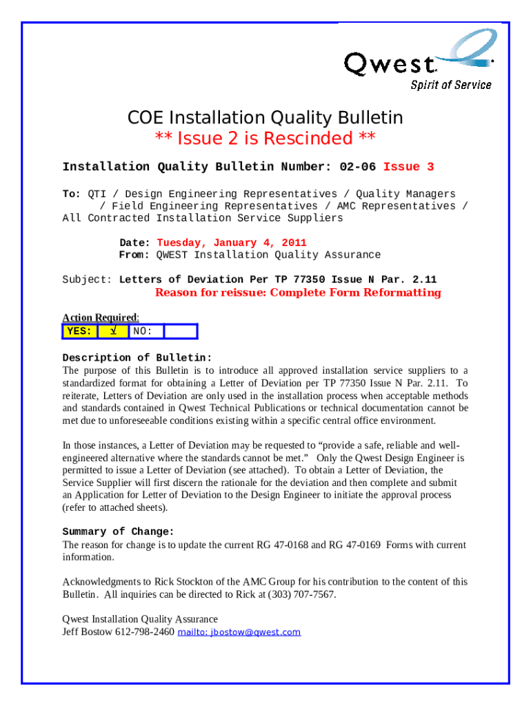 The Installation Quality Bulletin 10-07. Fiber Distribution Frame Standard Connector Change is a document that can be filled-out and signed for specific reasons. Next, it is furnished to the relevant addressee in order to provide certain info of any kinds. The completion and signing is available manually in hard copy or with a suitable service like PDFfiller. These applications help to complete any PDF or Word file without printing out. While doing that, you can customize its appearance for your requirements and put an official legal e-signature. Upon finishing, you send the Installation Quality Bulletin 10-07. Fiber Distribution Frame Standard Connector Change to the respective recipient or several ones by email and also fax. PDFfiller has a feature and options that make your Word form printable. It offers different settings when printing out. It does no matter how you'll file a form - in hard copy or by email - it will always look neat and firm. To not to create a new file from the beginning all the time, make the original document as a template. Later, you will have an editable sample.