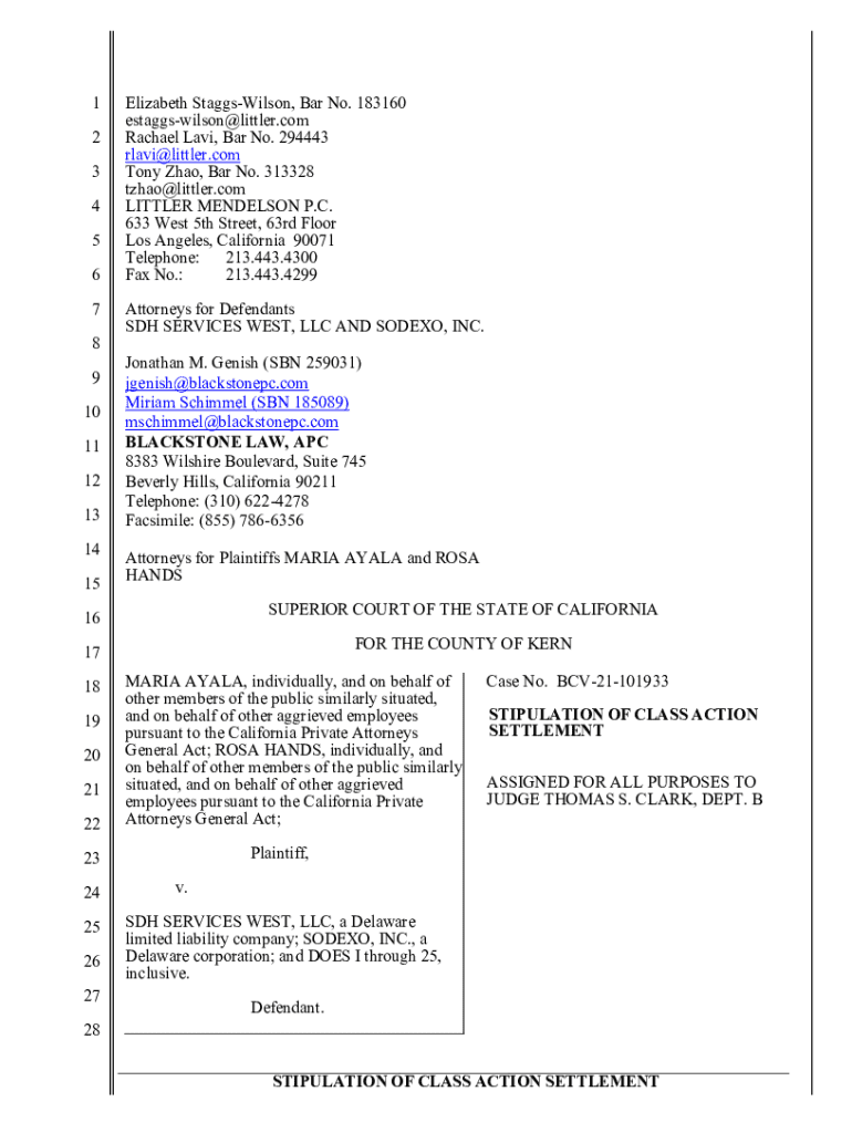 1 2 3 4 5 6 7 8 9 10 11 12 13 14 15Elizabeth StaggsWilson, Bar No. 183160 estaggswilson@littler.com Rachael Lavi, Bar No. 294443 rlavi@littler.com Tony Zhao, Bar No. 313328 tzhao@littler.com LITTLER MENDELSON P.C. 633 West 5th Street, 63rd Floor Los Angeles, California 90071 Telephone: 213.443.4300 Fax No.: 213.443.4299 Attorneys for Defendants SDH SERVICES WEST, LLC AND SODEXO, INC. Jonathan M. Genish (SBN 259031) jgenish@blackstonepc.com Miriam Schimmel (SBN 185089)...