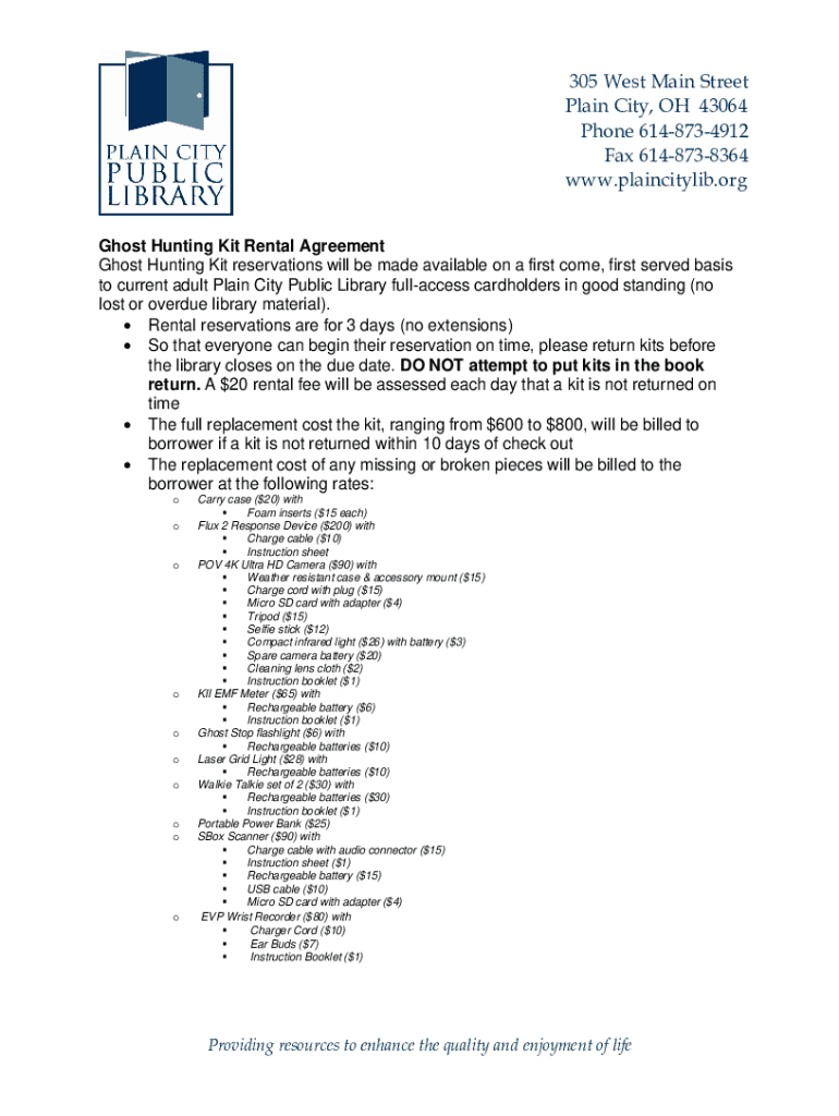305 West Main Street Plain City, OH 43064 Phone 6148734912 Fax 6148738364 www.plaincitylib.org Ghost Hunting Kit Rental Agreement Ghost Hunting Kit reservations will be made available on a first come, first served basis to current adult Plain City Public Library fullaccess cardholders in good standing (no lost or overdue library material). Rental reservations are for 3 days (no extensions) So that everyone can begin their reservation on time, please return kits before the library closes on...