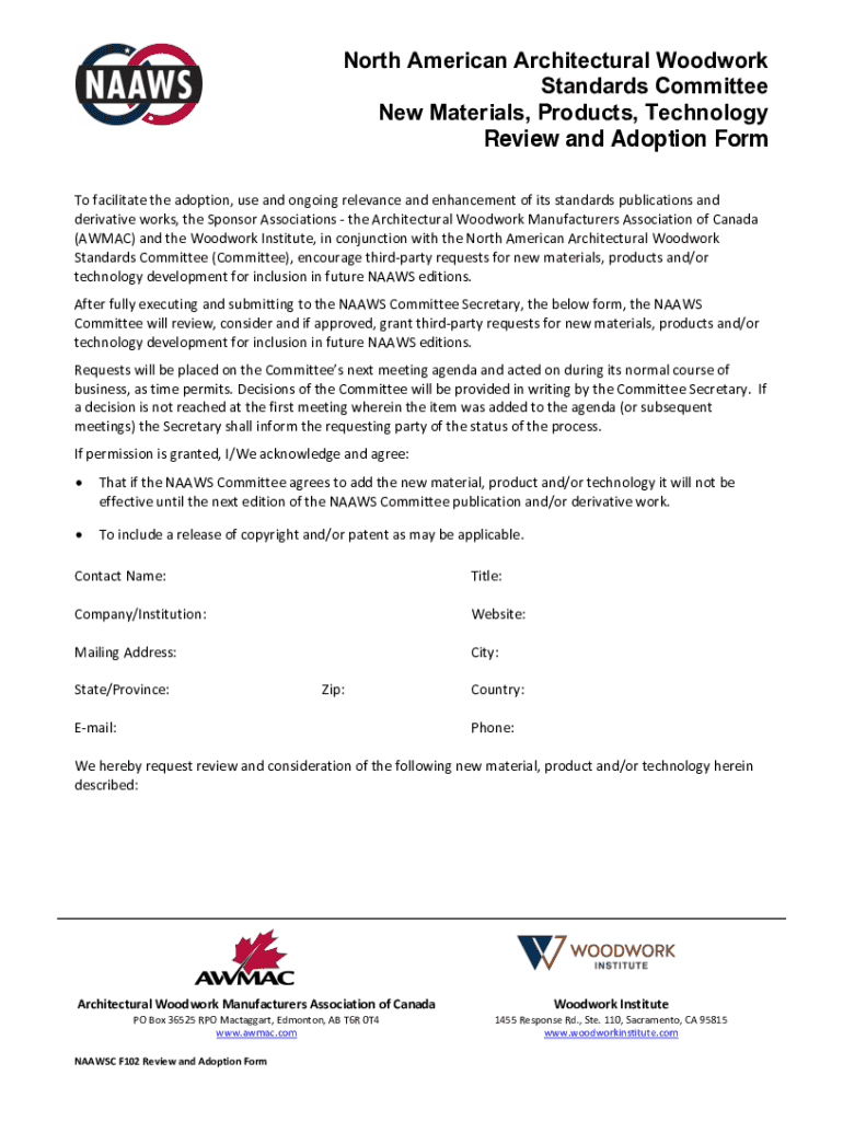 North American Architectural Woodwork Standards Committee New Materials, Products, Technology Review and Adoption Form To facilitate the adoption, use and ongoing relevance and enhancement of its standards publications and derivative works, the Sponsor Associations the Architectural Woodwork Manufacturers Association of Canada (AWMAC) and the Woodwork Institute, in conjunction with the North American Architectural Woodwork Standards Committee (Committee), encourage thirdparty requests for new