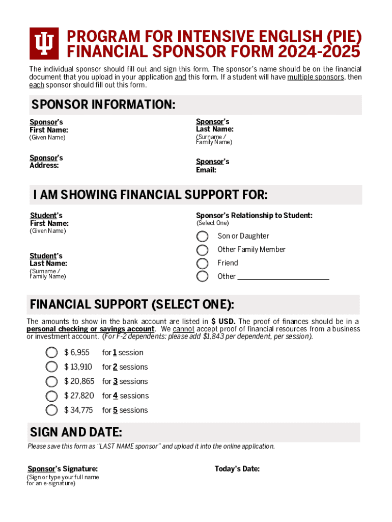 PROGRAM FOR INTENSIVE ENGLISH (PIE) FINANCIAL SPONSOR FORM 20242025 The individual sponsor should fill out and sign this form. The sponsors name should be on the financial document that you upload