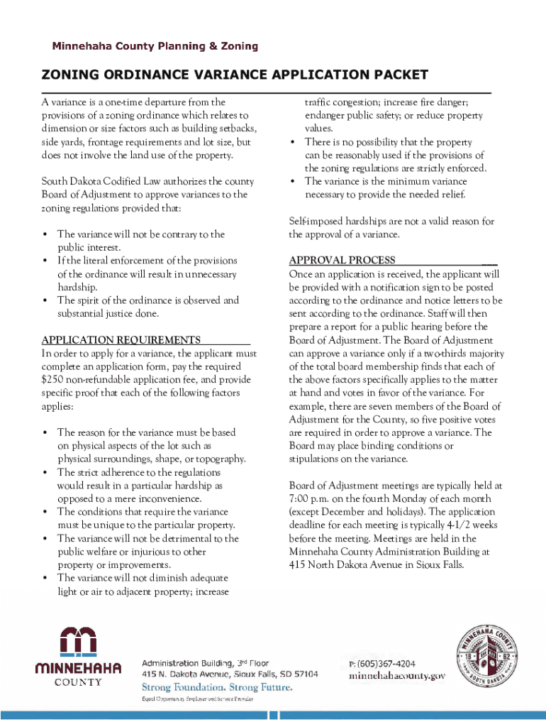 ZONING ORDINANCE VARIANCE APPLICATION PACKET A variance is a onetime departure from the provisions of a zoning ordinance which relates to dimension or size factors such as building setbacks, side yards, frontage requirements and lot size, but does not involve the land use of the property. South Dakota Codified Law authorizes the county Board of Adjustment to approve variances to the zoning regulations provided that: The variance will not be contrary to the public interest. If the literal