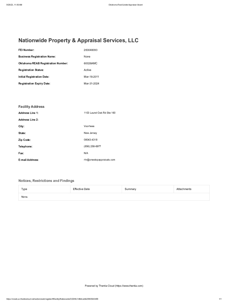 9/26/23, 11:06 AMOklahoma Real Estate Appraiser BoardNationwide Property & Appraisal Services, LLC FEI Number:263048093Business Registration Name:NoneOklahoma REAB Registration Number:60026AMCRegistration