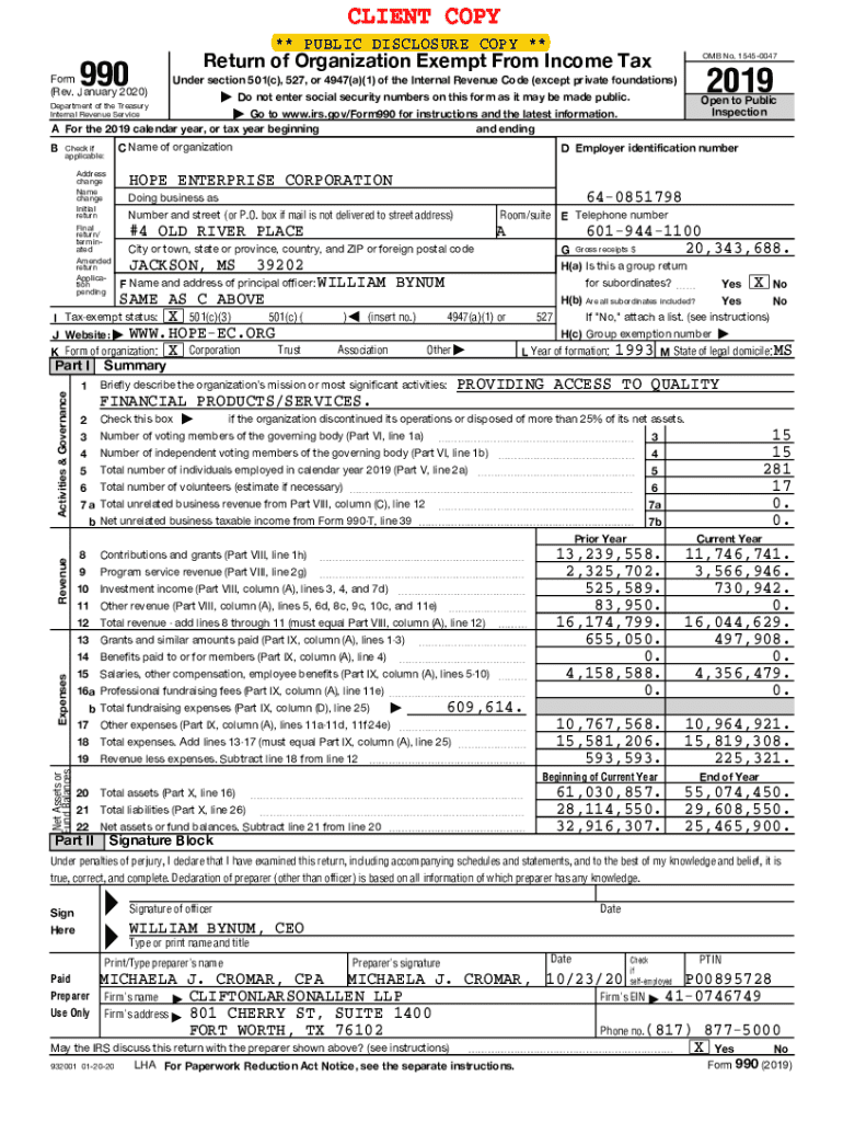 The hope-enterprise-corporation-form-990-2019 is an annual informational tax return that nonprofit organizations in the United States must file with the IRS. It provides details about the organization's financial condition, operations, and governance.