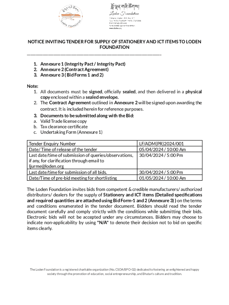 NOTICE INVITING TENDER FOR SUPPLY OF STATIONERY AND ICT ITEMS TO LODEN FOUNDATION ___ 1. Annexure 1 (Integrity Pact / Integrity Pact) 2. Annexure 2 (Contract Agreement) 3. Annexure 3 ( Bid Forms 1 and 2) Note: 1. All documents must be signed, officially sealed, and then delivered in a physical copy enclosed within a sealed envelope. 2. The Contract Agreement outlined in Annexure 2 will be signed upon awarding the contract. It is included herein for reference purposes. 3. Documents to be...