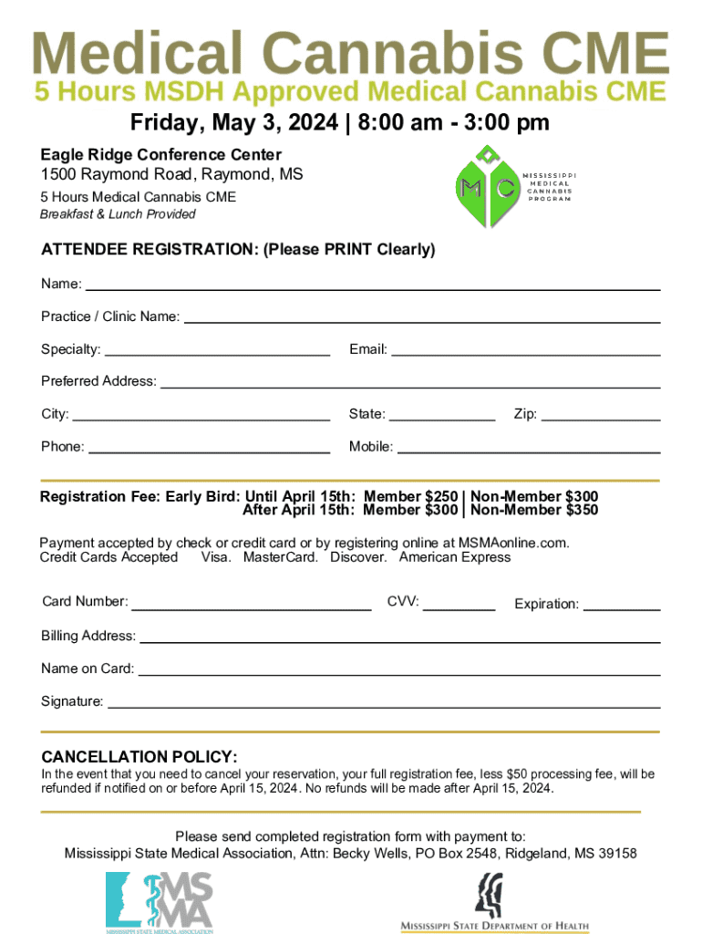 Friday, May 3, 2024 | 8:00 am 3:00 pm Eagle Ridge Conference Center 1500 Raymond Road, Raymond, MS 5 Hours Medical Cannabis CME Breakfast & Lunch ProvidedATTENDEE REGISTRATION: (Please PRINT Clearly)