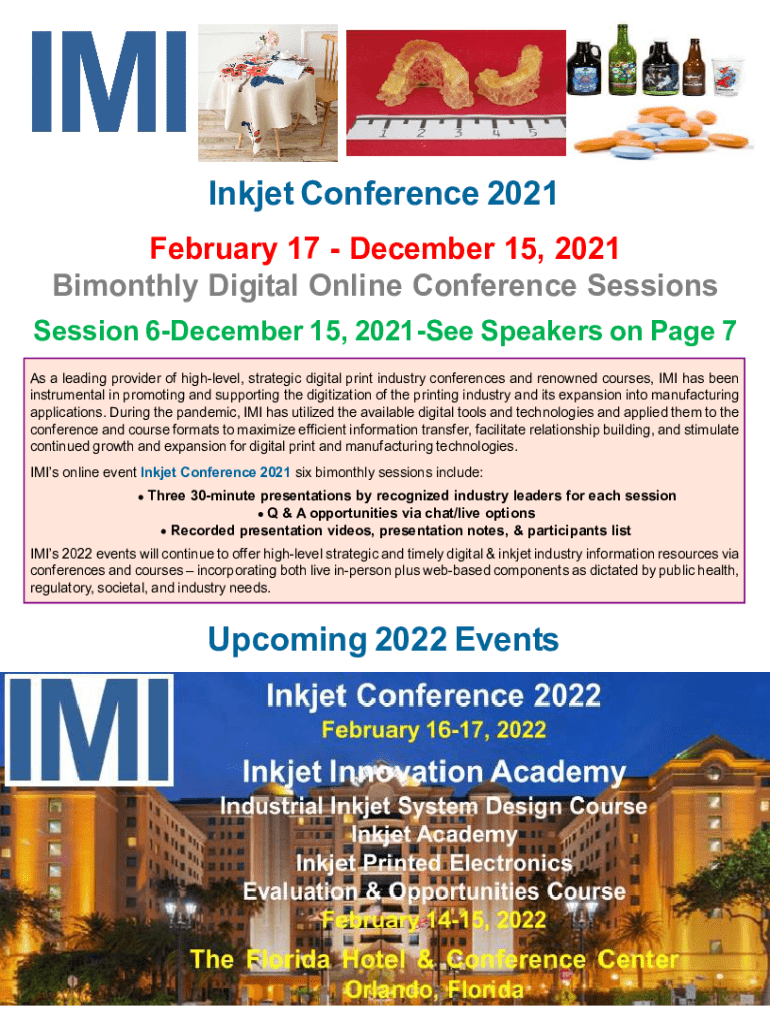 Inkjet Conference 2021 February 17 December 15, 2021 Bimonthly Digital Online Conference Sessions Session 6December 15, 2021See Speakers on Page 7 As a leading provider of highlevel, strategic digital print industry conferences and renowned courses, IMI has been instrumental in promoting and supporting the digitization of the printing industry and its expansion into manufacturing applications. During the pandemic, IMI has utilized the available digital tools and technologies and applied them