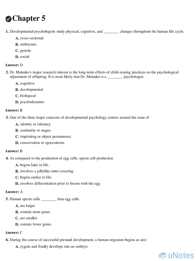 Chapter 5 1. Developmental psychologists study physical, cognitive, and ___ changes throughout the human life cycle. A. crosssectional B. embryonic C. genetic D. social Answer: D 2. Dr. Matsuko\'s