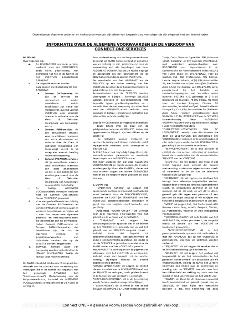 Onderstaande algemene gebruiks en verkoopvoorwaarden zijn alleen van toepassing op voertuigen die zijn uitgerust met een telematicaboxINFORMATIE OVER DE ALGEMENE VOORWAARDEN EN DE VERKOOP VAN CONNECT