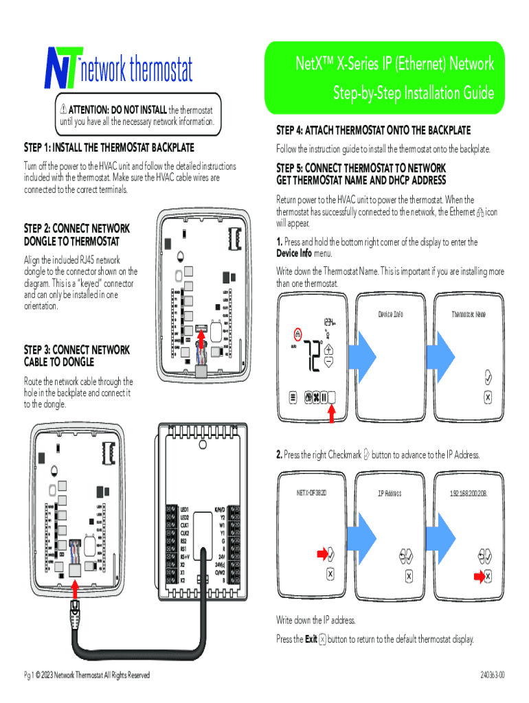 NetX XSeries IP (Ethernet) Network C ATTENTION: DO NOT INSTALL the thermostat until you have all the necessary network information.STEP 1: INSTALL THE THERMOSTAT BACKPLATE Turn off the power to the HVAC unit and follow the detailed instructions included with the thermostat. Make sure the HVAC cable wires are connected to the correct terminals.STEP 2: CONNECT NETWORK DONGLE TO THERMOSTAT Align the included RJ45 network dongle to the connector shown on the diagram. This is a keyed connector and