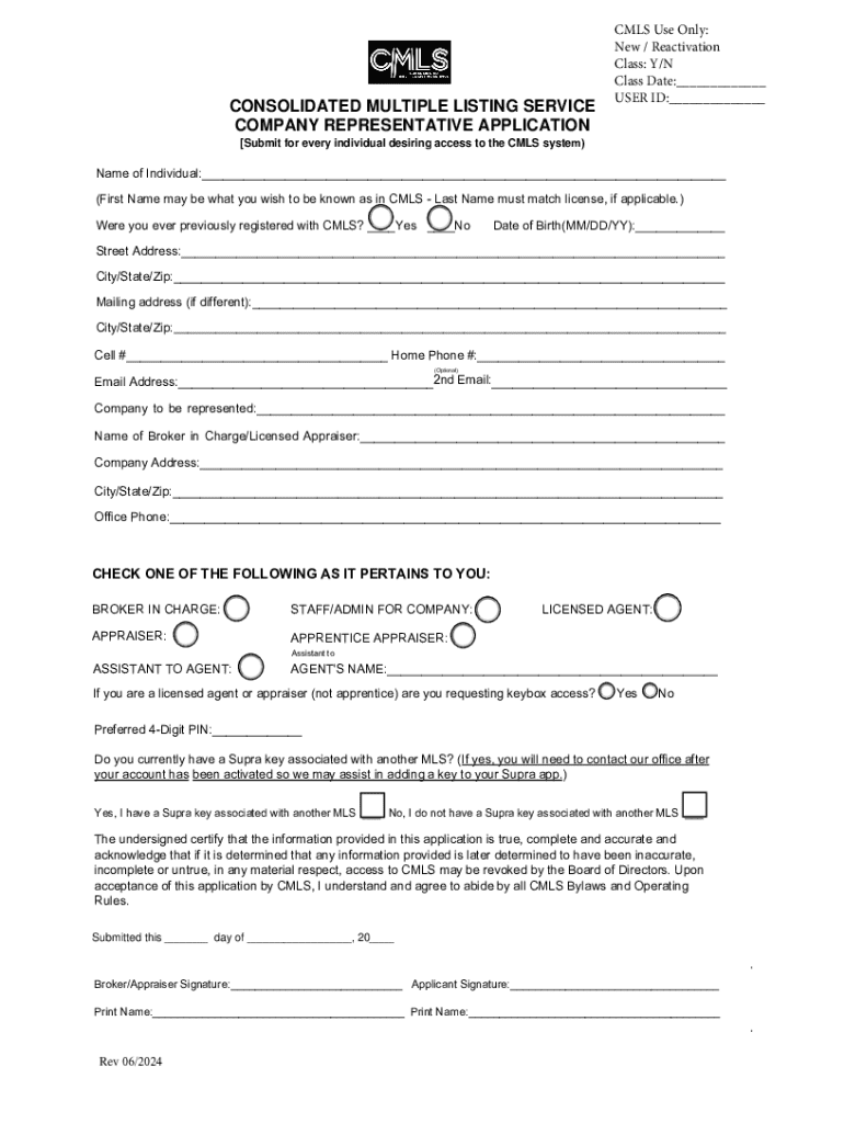 CONSOLIDATED MULTIPLE LISTING SERVICE REQUEST FOR ACCESS (NEW USER OR REACTIVATION) All new users applying for access along with those requesting to reactivate with CMLS must submit the Company Representative Application. Only those licensed agents and licensed appraisers requesting keybox access need to complete the Key Lease Agreement. All fees for new users are due at the time of initial training. If reactivating, please contact the CMLS office regarding fees that are due. FEES: ALL...