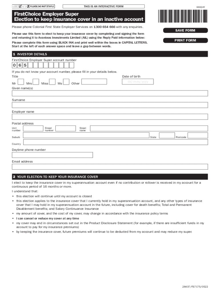 THIS IS AN INTERACTIVE FORMB8BQHRFirstChoice Employer Super Election to keep insurance cover in an inactive account Please phone Colonial First State Employer Services on 1300 654 666 with any enquiries.SAVE FORMPlease use this form to elect to keep your insurance cover by completing and signing the form and returning it to Avanteos Investments Limited (AIL) using the Reply Paid information below:PRINT FORMPlease complete this form using BLACK INK and print well within the boxes in CAPITAL...