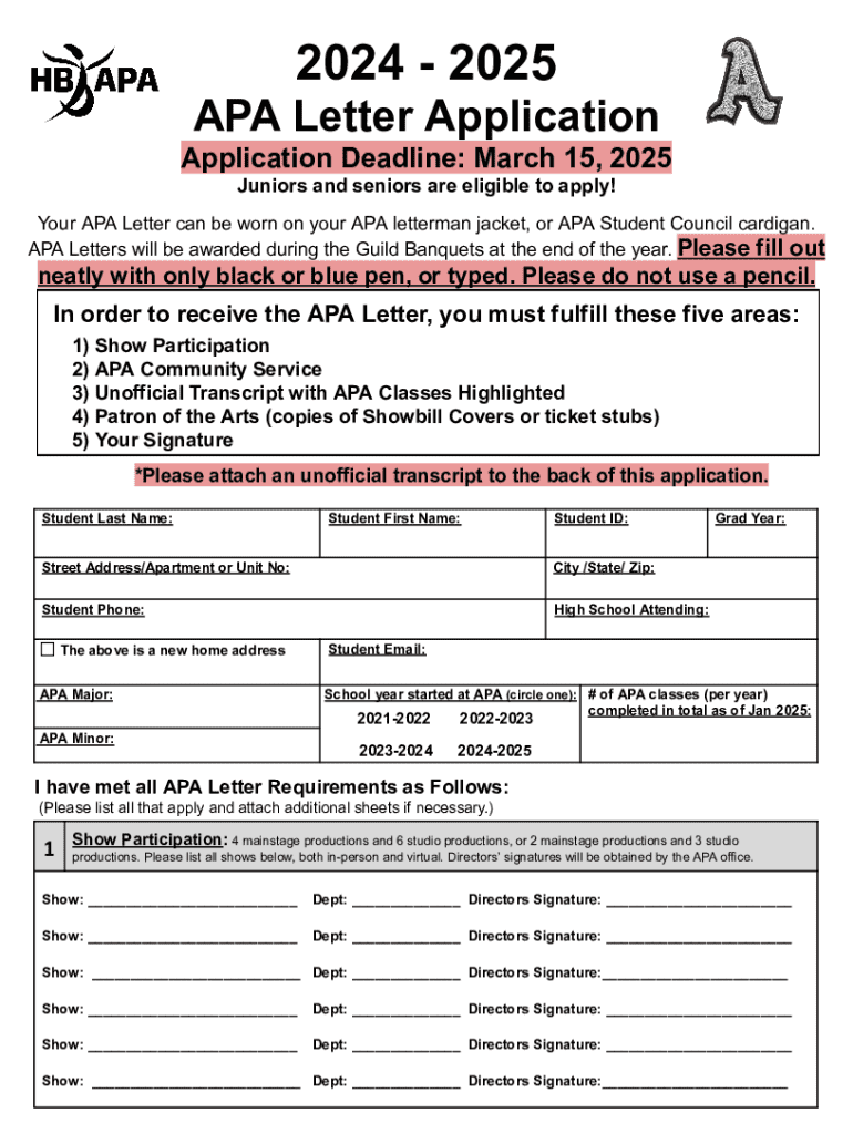 2024 2025 APA Letter Application Application Deadline: March 15, 2025 Juniors and seniors are eligible to apply! Your APA Letter can be worn on your APA letterman jacket, or APA Student Council cardigan. APA Letters will be awarded during the Guild Banquets at the end of the year. Please fill outneatly with only black or blue pen, or typed. Please do not use a pencil.In order to receive the APA Letter, you must fulfill these five areas: 1) Show Participation 2) APA Community Service 3)...