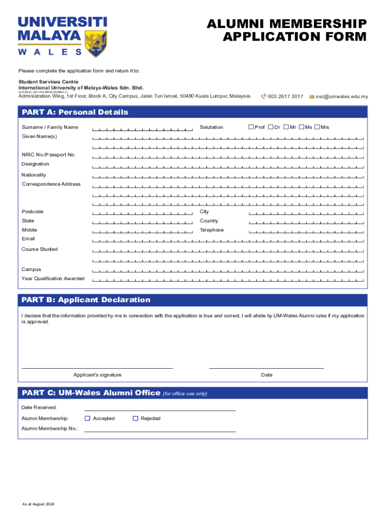 The UMW Alumni Application Form comes with several key features designed to enhance user experience and facilitate seamless enrollment into the alumni network. One standout feature is its easy access to personalized information, allowing alumni to modify their details, update their status, and manage their alumni profile conveniently.