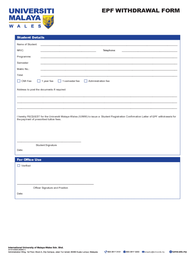 EPF WITHDRAWAL FORMStudent Details Name of Student:___NRIC:___Programme:___Semester:___Matric No.:___Total:___ 1 year feeCMI Fee1 semester feeTelephone:___Administration feeAddress to post the documents if required: ___ ___ ___ I hereby REQUEST for the Universiti MalayaWales (IUMW) to issue a Student Registration Confirmation Letter of EPF withdrawals for the payment of prescribed tuition fees.___ Student Signature Date:For Office Use VerifiedOfficer Signature and Position Date:enquiry@iumw